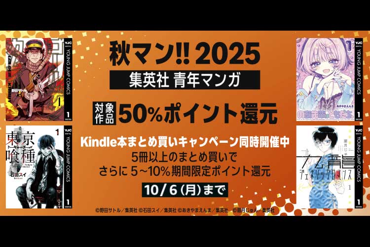 Kindleストアで集英社セール『秋マン!!2025』青年マンガ編がスタートし3日限定で50%ポイント還元になりました!