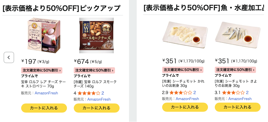 Amazonフレッシュ 対象品がレジにて50%OFF!!