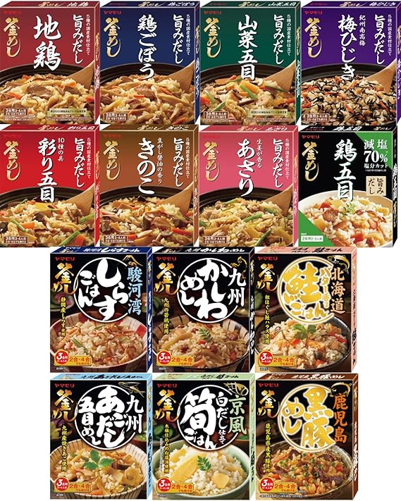 地鶏、鶏ごぼう、山菜五目、などなどヤマモリの釜めしの素14品がバラエティ豊かにセットになっています。