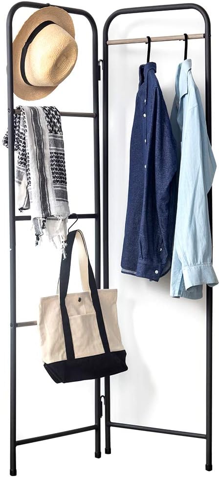 平たく折り畳める設計。サイズは幅67cm×奥行35cm×高さ150cm。耐荷重5kgなので、荷物の入ったバッグなどを掛けるとオーバーするかもしれません!