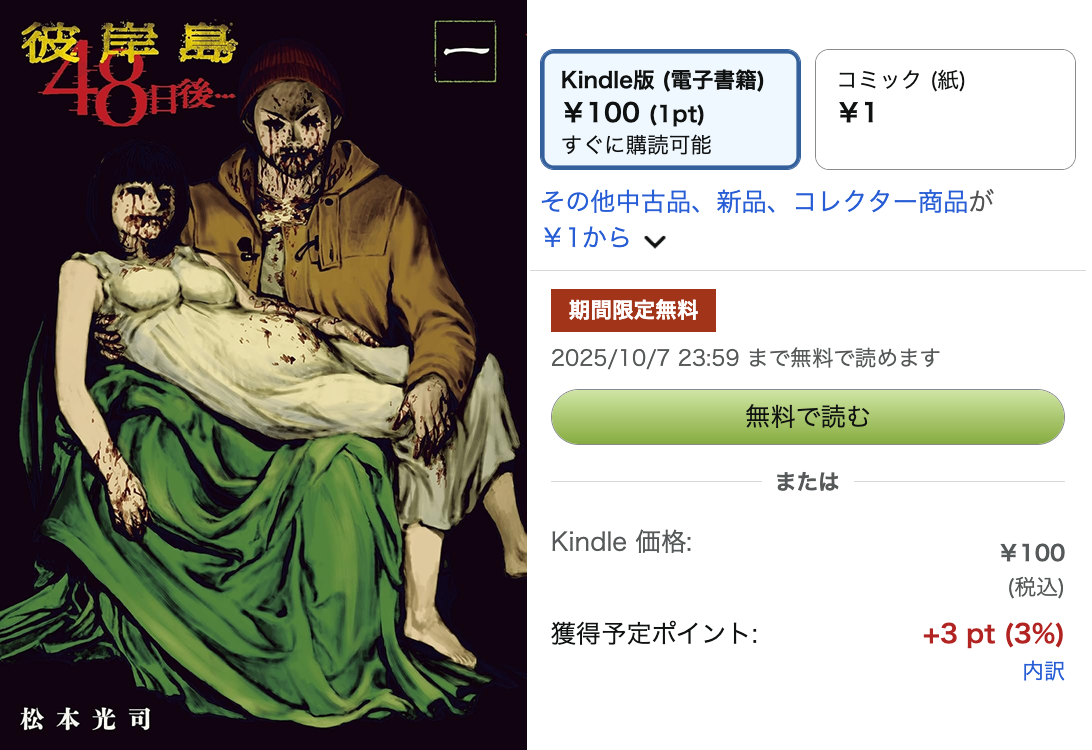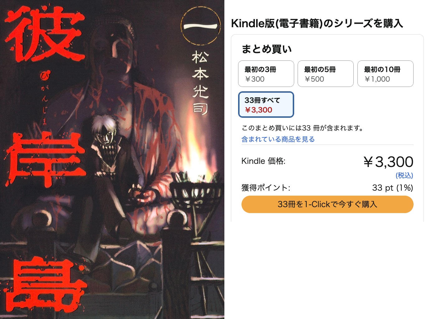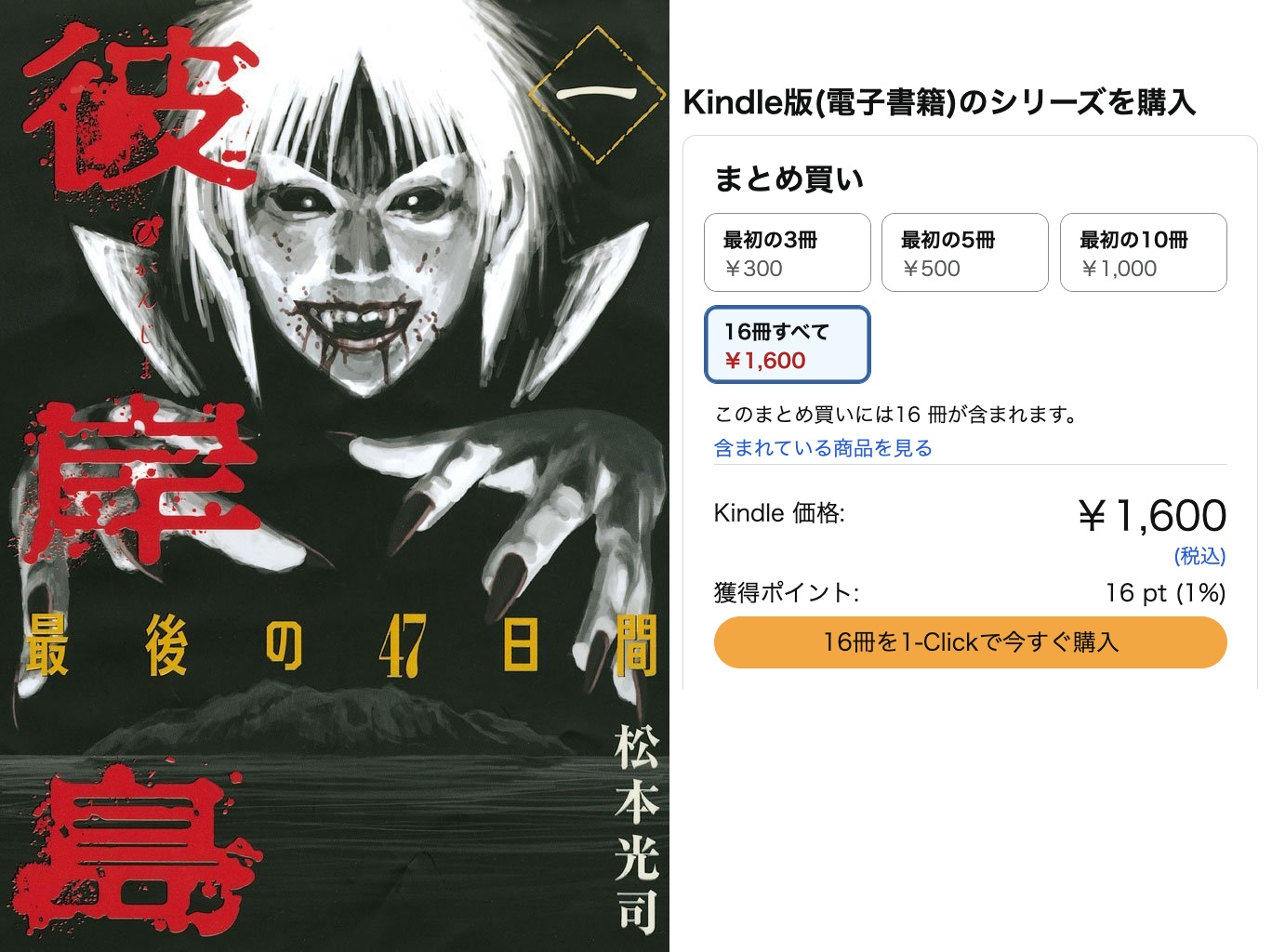 第1作となる『彼岸島』全33巻。続きの『最後の47日間』全16巻。最新シーズンの『48日後…』が最新51巻のうち1〜15巻までの計64冊が対象です。セール期限は10/19まで!