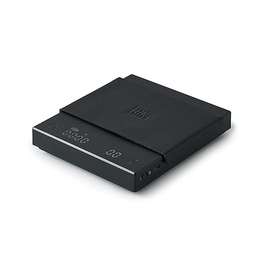 抽出時間と計量を同時に出来るブツ。国産レザーカバーを使用しているのが唯一無二な感じでカッコイイですね!USB-Cで充電可能。表示はオシャレなLEDパネル。計量範囲は0.5g-2000gで、精度0.1g単位が1000gまでOKと、お菓子作りなどのキッチン計量器としても使えるブツ。珈琲向け機能としては抽出開始からタイマーと計量をスタートする自動モードを搭載しています。