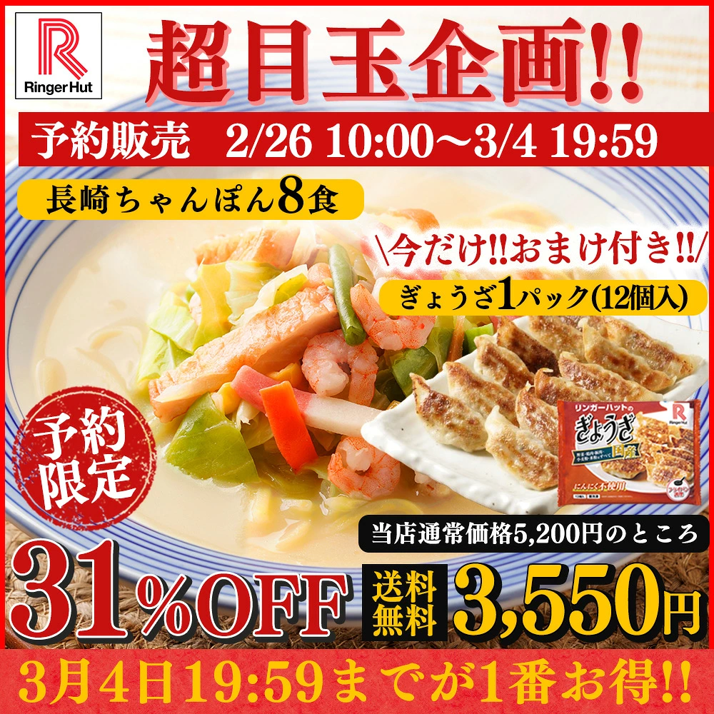 リンガーハット楽天市場店にて『長崎ちゃんぽん8食セット【具付き】【冷凍】ぎょうざ1パック(12個入)おまけ付き』が3,550円送料無料に!予約注文です。