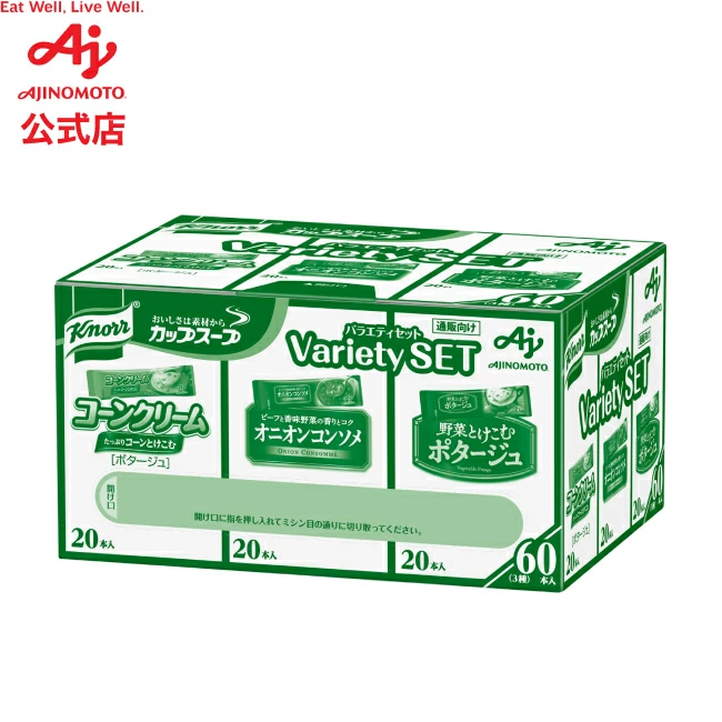 コーンクリーム、ポタージュ、オニオンコンソメの3つのメニューを詰め合わせたインスタントスープのアソートセット。各20本、合計60本入り。最短7月末賞味期限の商品が届く場合があるとのこと。